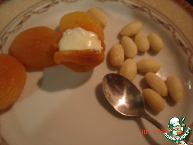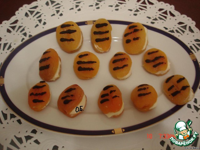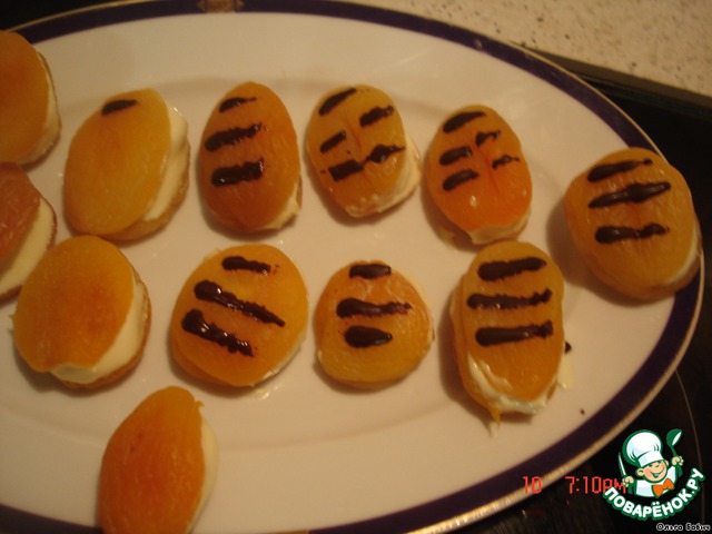 Разрезать сбоку курагу, положить орех и шоколадную массу.