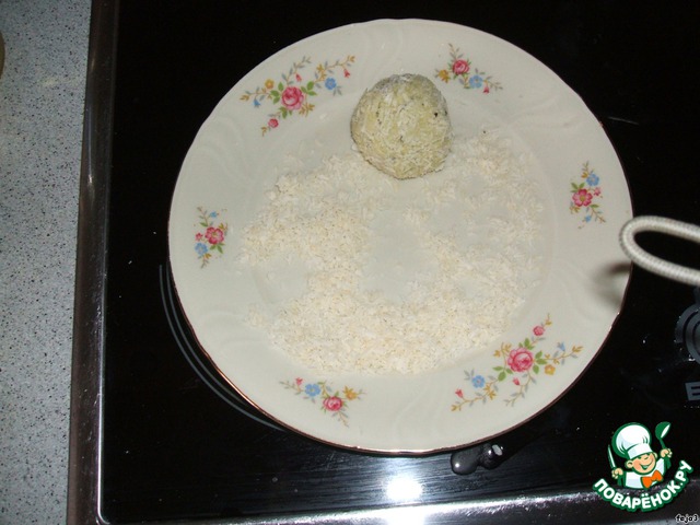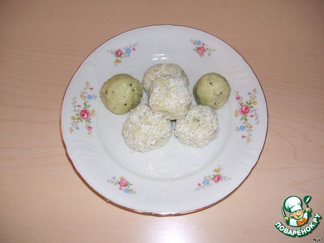 Сформировать небольшие шарики и обвалять в кокосовой стружке.
