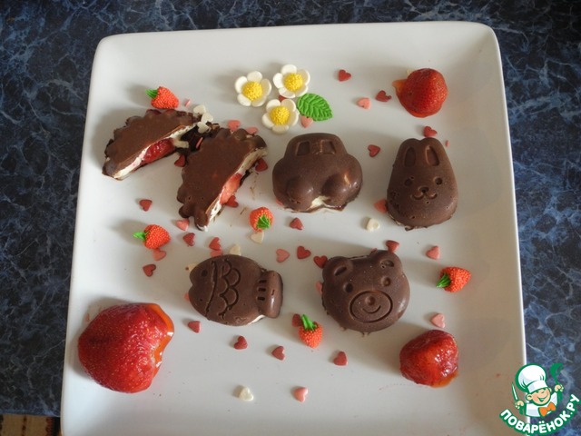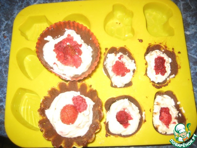 В формы выложить сырную массу, на 1/3, в серединке сделать углубление для фруктов, или джема. Выложить фрукты, накрыть сырной массой, разровнять поверхность, залить шоколадом и отправить в морозилку на 20-30 мин.
