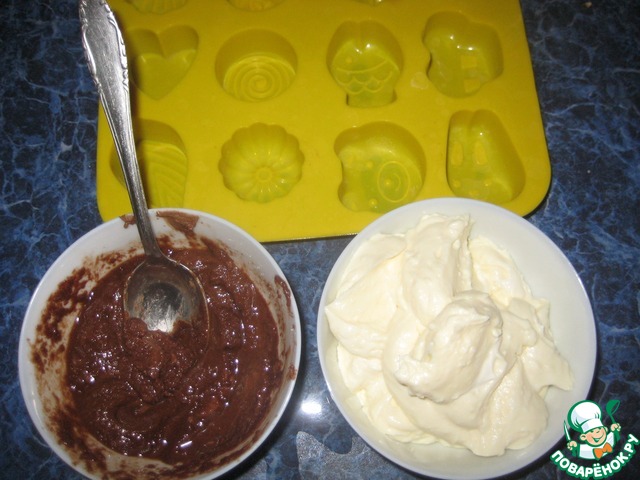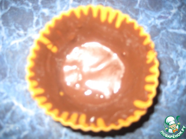 Растопить шоколад на водяной бане, стенки и дно силиконовых форм смазать с помощью кисточки шоколадом. Отправить в морозилку на 20 мин.