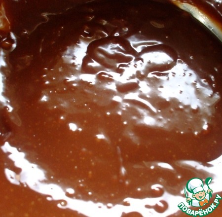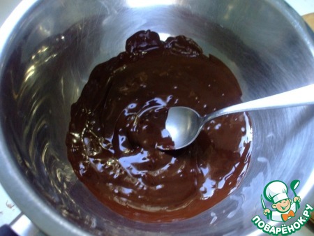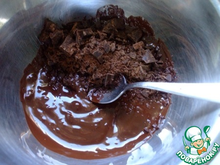 Когда весь шоколад растопится, добавить в него порубленную одну-третью часть. Перемешать, не суетясь, до гладкости и однородности ложечкой. Должна получиться гладкая, блестящая масса.