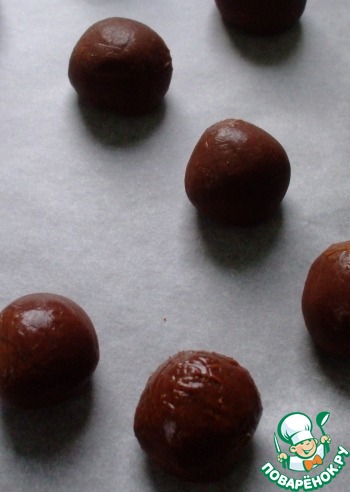 Ложечкой (чайной удобнее всего) набираем массу из миски, скатываем ее в шарики…. Ручками,) желательно надеть перчатки, чтобы и самой не запачкаться, и масса не сильно таяла. Шарики выкладываем на пекарскую бумагу. Помещаем в морозильную камеру минут на 30-40. Можно и дольше.)