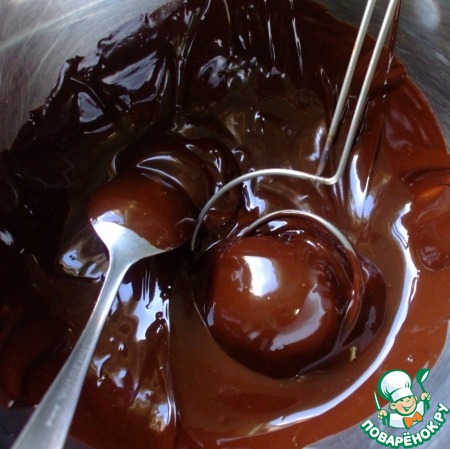 Достаем наши трюфельки из морозилки, и с помощью ложки (а лучше двух), или в помощью специального прибора, которым пользовалась я (здесь на фото его видно –спираль с ручкой))), купаем их в растопленном шоколаде, чтобы все бочка были покрыты.