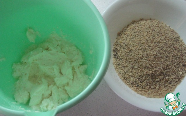 Соединить нашу творожную часть и орехово-печеньевую. Всё тщательно перемешать.