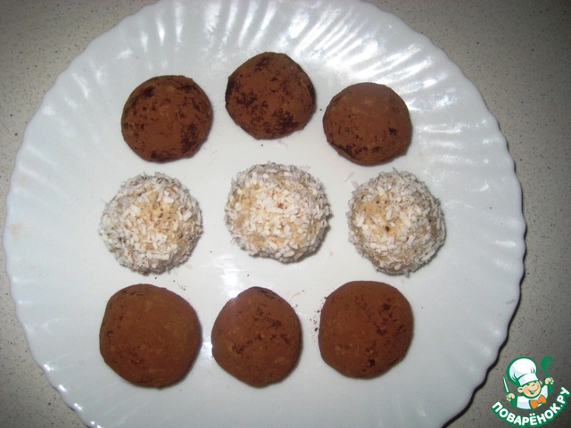 Обвалять шарики в какао. Я не удержалась и часть конфет сделала в кокосовой стружке - "для девочек" - как сказал сын.