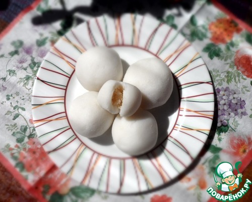 Вскипятите 180 мл воды, добавьте щепотку соли и постепенно вливайте воду в рис (возможно, понадобится меньше воды). Когда рисовая смесь остынет, начинаем лепить из нее шарики. Чтобы рисовая смесь не прилипала к рукам, их нужно немного смочить водой. Из такого количества рисовой смеси получается примерно 5 средних шариков. Возьмите 1/5 часть рисовой смеси и сделайте из нее лепешку, в середину положите примерно чайную ложку начинки и слепите шарик. Варите шарики на пару примерно 20-25 минут. Подавайте теплыми!