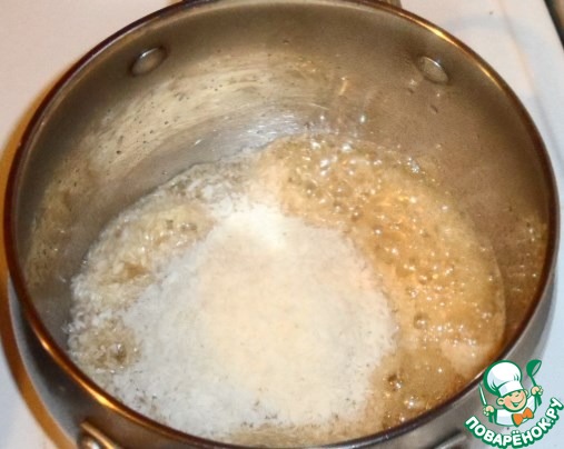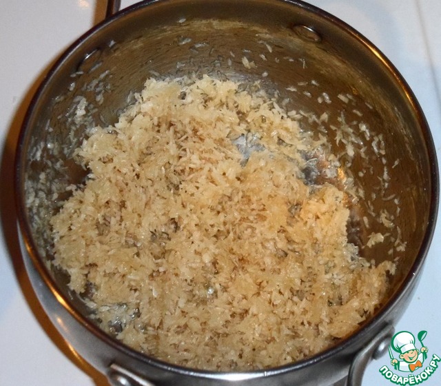 Добавьте топленое масло и варите смесь, пока вся жидкость не впитается. Добавьте мускатный орех и снимите с огня. Хочу заметить, что для начинки мне хватило половины кокосовой стружки.