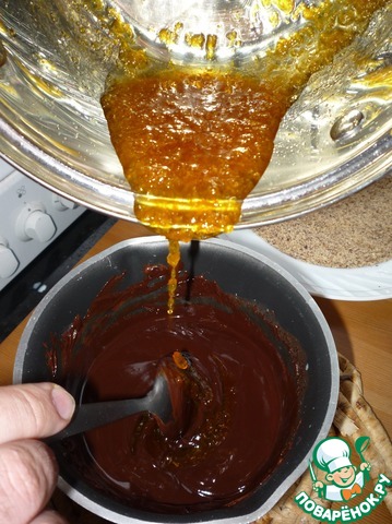 Добавляем к шоколаду масло и ставим на водяную баню. Когда шоколад растопится, добавляем к нему горячие сливки, апельсиновую карамель с цедрой и перемешиваем.