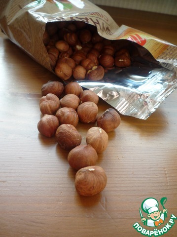 Орехи (у меня фундук) измельчить в кофемолке (я за неимением сего устройства измельчила при помощи блендера).
