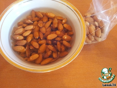 Замачиваем миндаль в кипятке на несколько минут. Сливаем воду, и очищаем от кожуры. По оригиналу рецепта миндаль нужно замочить в холодной воде на 5-6 часов, но я этого не делала