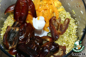 Фисташки и очищенный от кожуры миндаль измельчаем в блендере. После этого добавляем туда финики без косточек и цедру 1 апельсина, а также какао-порошок (по рецепту молотые в порошок какао бобы). И размалываем все вместе, чтобы получилась однородная масса.