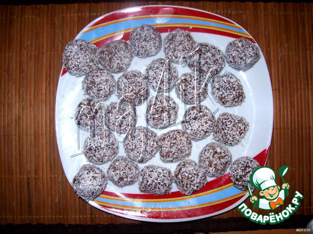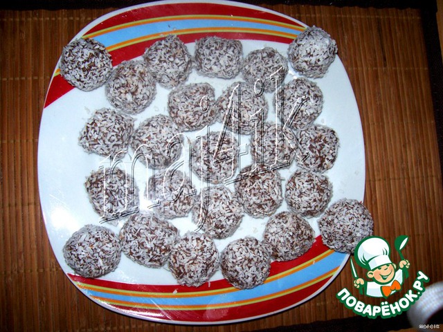 Из остывшей массы скатала шарики, положив в серединку одну M&Ms-синку. Обваляла шарики в кокосовой стружке
