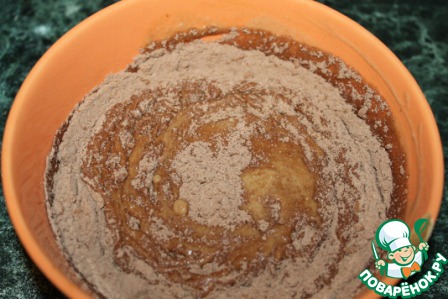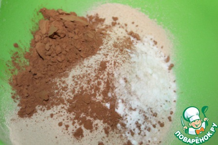 Просейте в миску муку, добавляем какао, соду, всё перемешиваем.