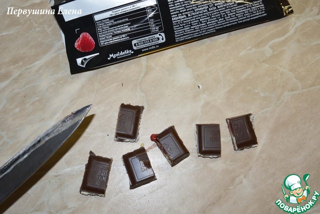 1/3 плитки шоколада разделить на порционные квадраты. У меня формочки маленькие, мне пришлось их разрезать пополам.