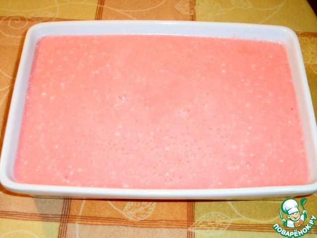 В отдельной миске смешайте воду, ванильный экстракт, кокосовое молоко и пищевой краситель (у меня гелевый красный, достаточно 1 капли). Соедините жидкие и сухие ингредиенты вместе, хорошо перемешайте до однородности. Вылейте смесь в форму, накройте фольгой и выпекайте примерно 60 минут. У меня по истечении этого времени сверху осталась жидкость, я дополнительно выпекала еще примерно 20 минут. Оставьте моти остывать в духовке.