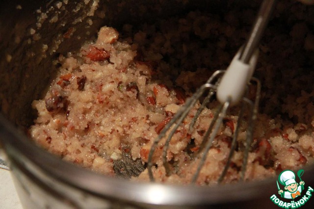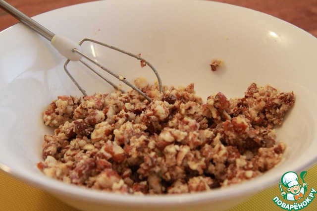 Вбейте сливочное масло и орехи в сахар, взбивайте до загустения.