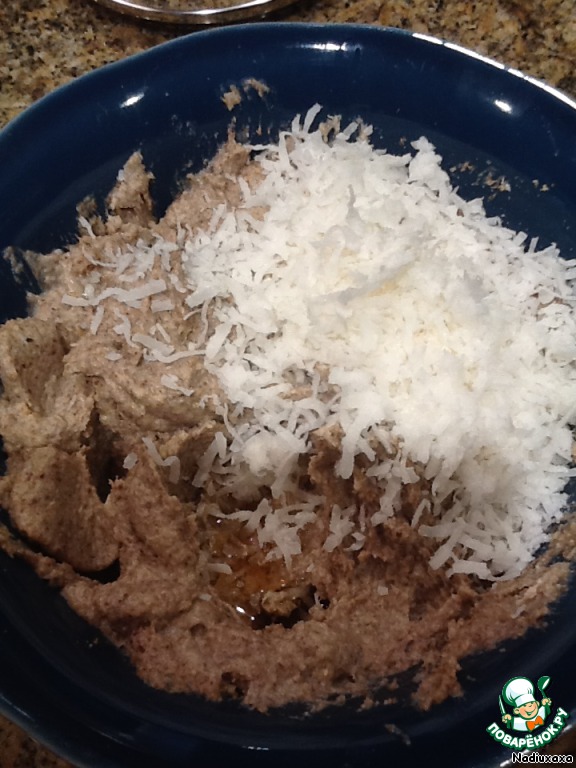 Вынимаем ореховую массу из холодильника. Если она все еще сильно липнет, добавляем кокосовую стружку. Кстати, еще можно добавить немного коньяка или рома для аромата.
