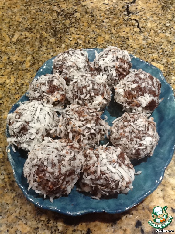 Обливаем шарики шоколадом и обваливаем в кокосовой стружке.