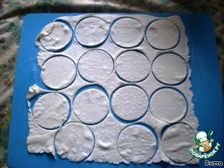Размораживаем слоеное тесто. Раскатываем его тонко. Вырезаем стаканом кружочки!