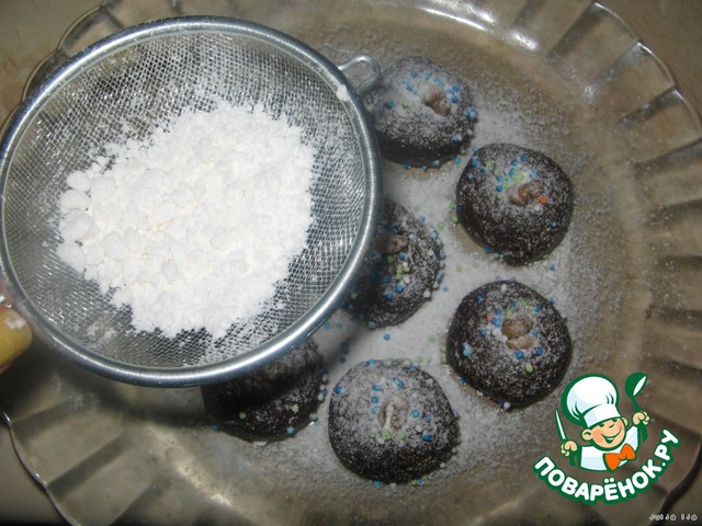 Посыпаем сахарной пудрой, украшаем кондитерской посыпкой. Ставим в морозильную камеру хотя бы на полчаса.