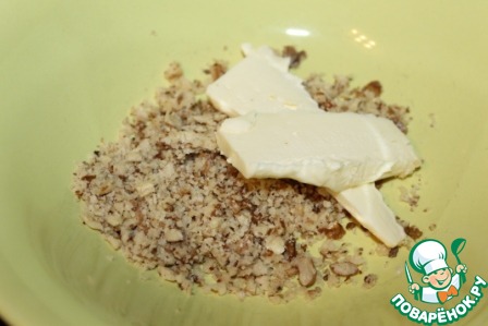 В отдельной миске смешиваем сливочное масло, комнатной температуры с измельчённым грецким орехом.
