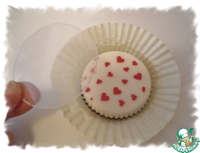 Аккуратно снять бумажную формочку и плёнку. Плёнка будет прозрачной, а вся картинка останется на шоколаде.