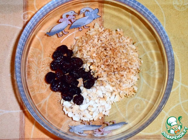 Растопите в сковороде на среднем огне половину масла и слегка обжарьте кешью до золотистого цвета (я взяла уже жареные орехи). Порубите их не очень мелко и положите в миску. Обжарьте изюм, чтобы он немного раздулся, и переложите к орехам. Слегка обжарьте на сковороде кокос (1-2 мин.) и переложите его к орехам и изюму.