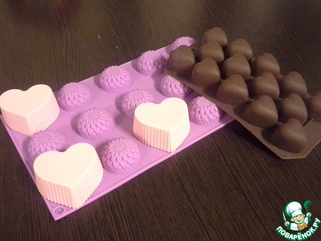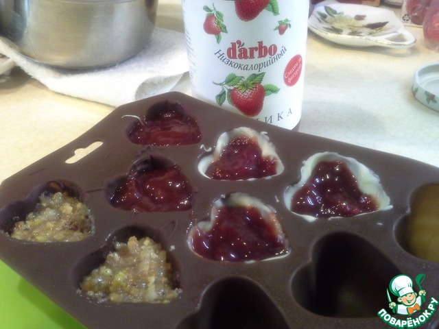 Затем достаем и раскладываем начинки. Сверху заливаем шоколадом и убираем еще на 20 минут в морозилку. Аккуратно выворачиваем формочки и достаем наши конфетки.