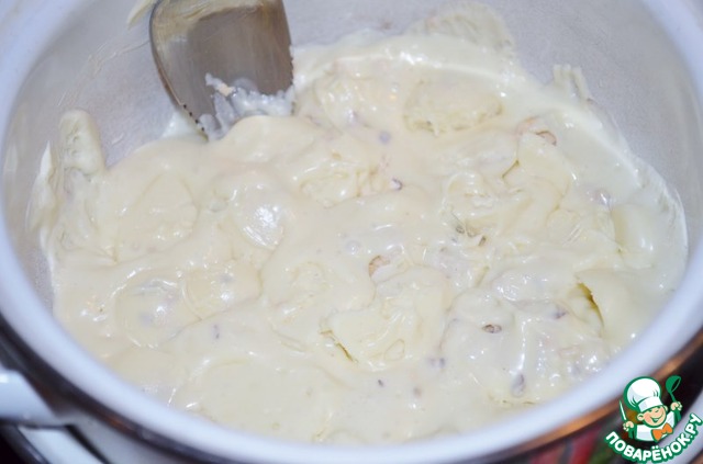 Растопить на водяной бане белый шоколад. У меня шоколад с орешками, поэтому они видны на фото.