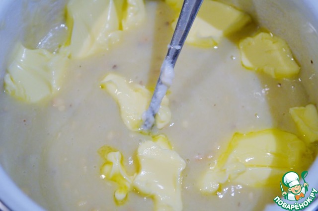 Добавить кусочками масло комнатной температуры и хорошо перемешать. Накрыть пищевой плёнкой, чтобы она плотно прилегала к поверхности, и поставить в холодильник на 2 часа.