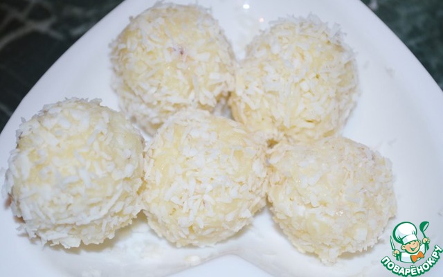 Из полученной массы формируем шарик, вовнутрь кладем миндаль и обваливаем в кокосовой стружке.