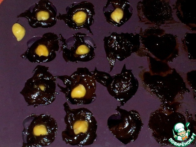 Одна девочка раскладывала в ячейки силиконовой формы шоколад маленькой ложечкой. Другая вдавливала в шоколад сахарный нут в форму - сердечки, затем коньячный нут в розочки и бантики. Верх запачкался. Я налила растительное масло в маленькую креманку. Обмакнув указательный пальчик старшая девочка сверху его поправила. Ячейки заполнены. Обтерев форму от масла и шоколада убрала её в морозильную камеру на 25 минут.