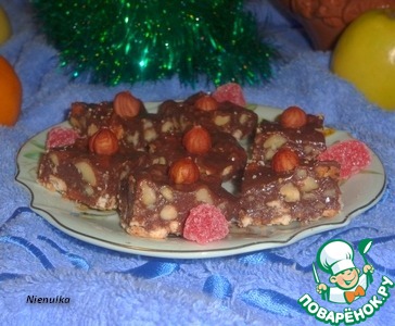 Выливаем основную массу в форму. Сверху раскладываем цельный фундук так, чтобы при делении на отдельные конфеты в середине одной конфеты был фундук.