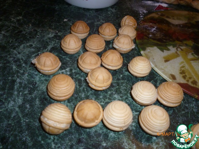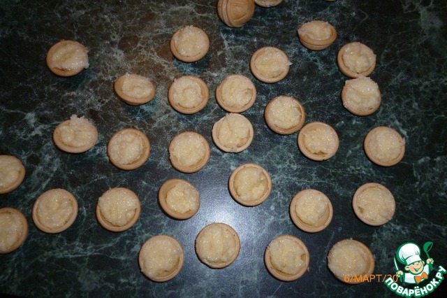 Масло сливочное, сгущенное молоко и сахар - взбить в крем. Наполнить половинки тарталеток.
