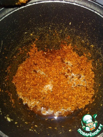 Засыпаем кокосовую стружку в масло. Обжариваем на сильном огне и постоянно интенсивно мешаем, пока стружка не станет темно-коричневого цвета