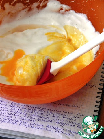 Желтки взбить слегка. Добавить желтки к белкам и осторожно перемешать.