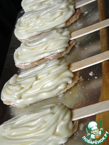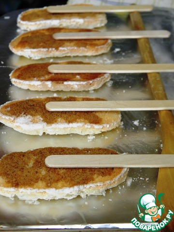 Печенье Савоярди выложить «лицом» вниз, на них положить палочки. Вообще, нужно было их с палочками выпекать сразу, но я почему-то проглядела)))