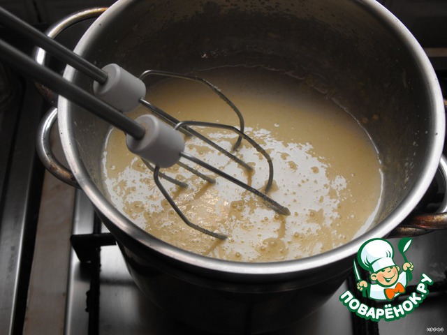 Снять яичную смесь с огня, добавить в неё пюре из персиков и взбить вместе около 1 мин. Остудить.