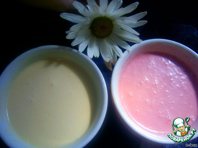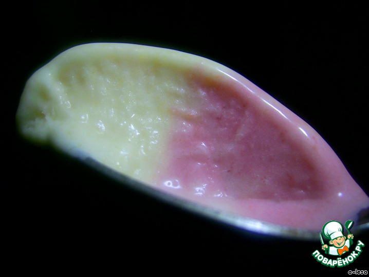 Разделить на две равные части. В одну добавить малину, во вторую - абрикос. Тщательно размешать.