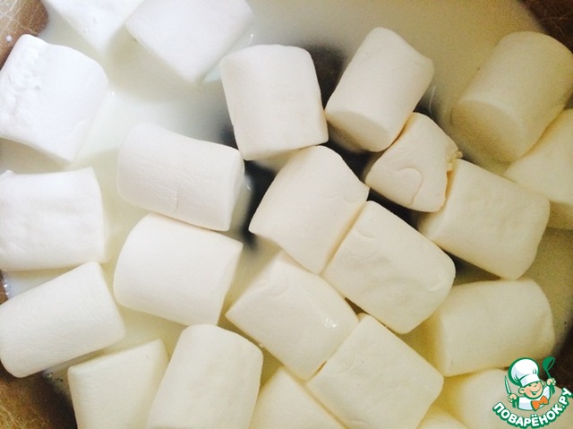 В кастрюлю налить примерно 80 г молока или жидких сливок, добавить маршмеллоу и поставить на огонь ниже среднего, постоянно помешивая смесь. Расплавляется маршмеллоу очень быстро - меньше минуты.