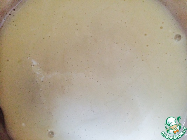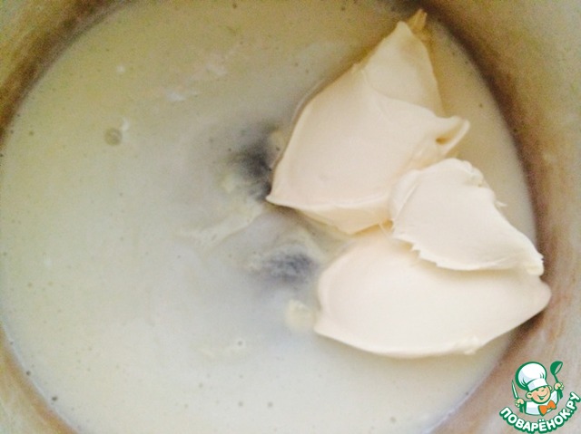 Охлаждаем смесь минуту-другую и добавляем сливки. Взбивайте миксером минуты 2-3, затем добавьте малюсенькую щепотку соды, и снова взбивайте еще 2 минуты. Получится красивая, воздушная смесь.