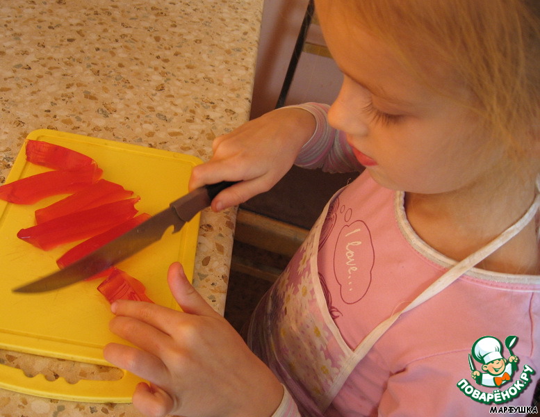 Достаем желе из формы и нарезаем произвольными кусочками - в этом мне помогает моя дочка.
