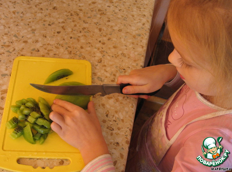 Очищаем киви и тоже нарезаем произвольными кусочками - и тут помощь очень кстати пришлась!