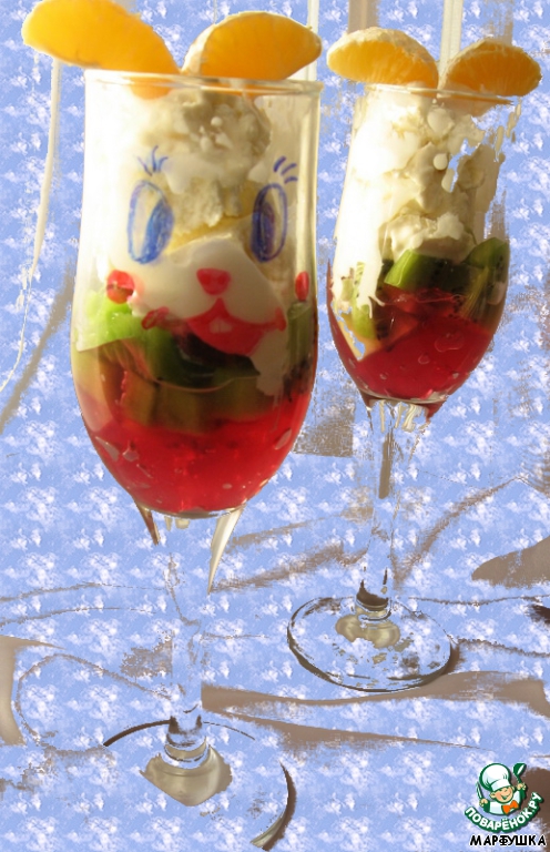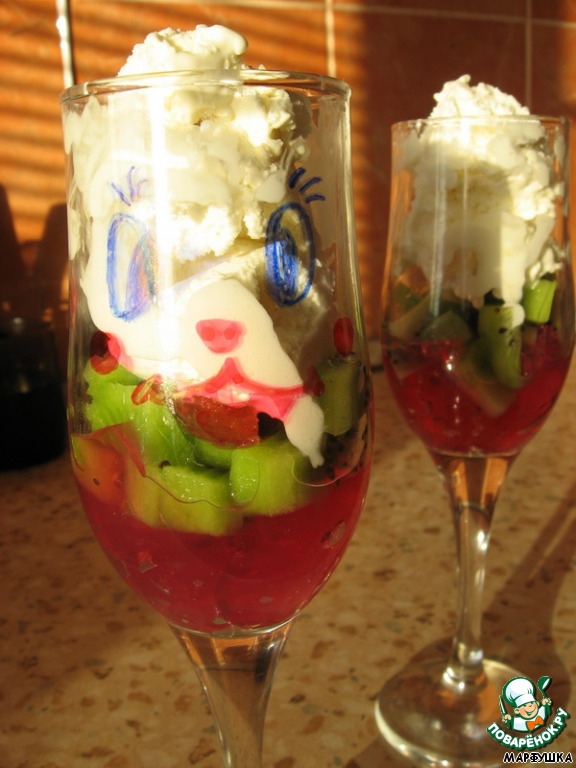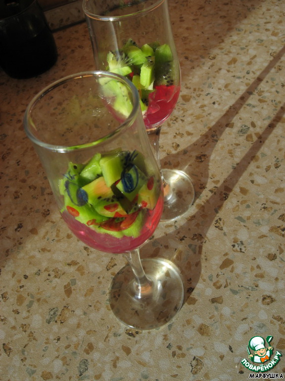 Накладываем "нарезку" в бокал - слой желе, затем слой киви.