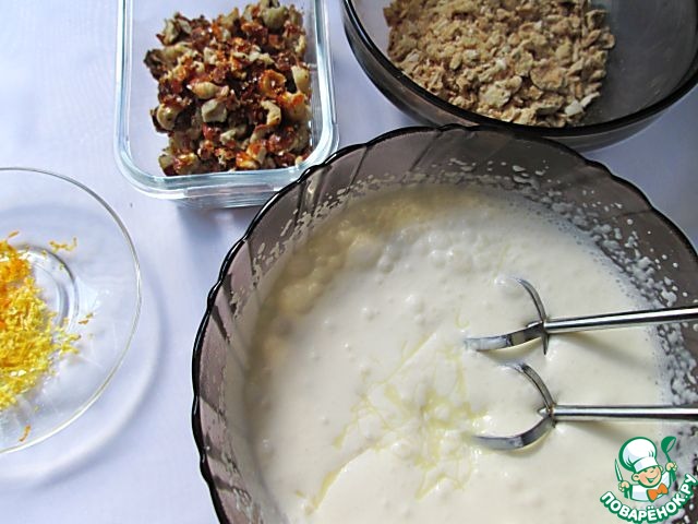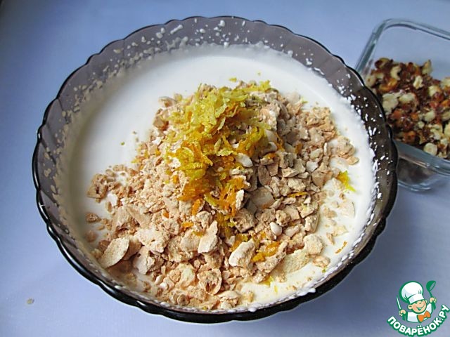 Аккуратно вручную перемешиваем сливки с измельченной цедрой и раскрошенным безе.