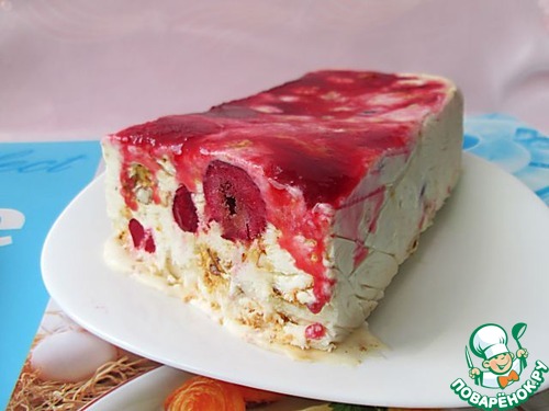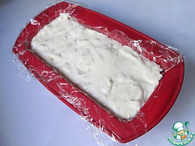 Аккуратно распределяем оставшиеся сливки, накрываем форму пищевой пленкой и ставим в морозильник минимум на несколько часов. Перемешивать массу во время застывания не нужно.