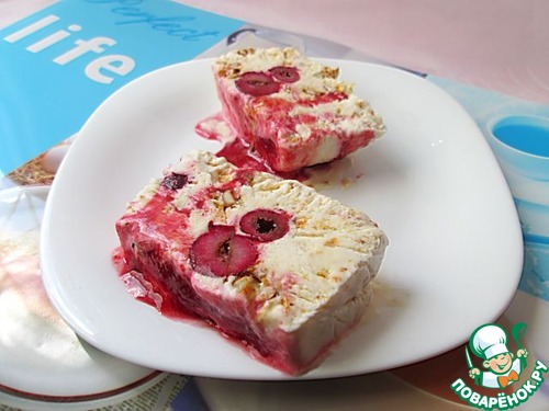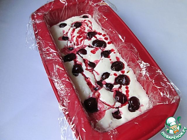 В форму выкладываем 2/3 сливок, ягоды вишни и вишневый соус. Соус можно сразу налить на дно формы - все равно он так или иначе там окажется.