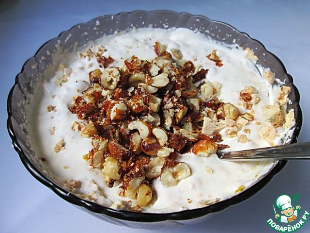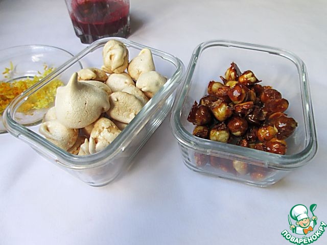 Нам понадобятся безе и орехи в карамели. Можно купить, можно сделать самостоятельно. Я готовила сама, но пошаговые снимать не стала, поскольку вариантов приготовления и того, и другого на сайте полно, однако на всякий случай вкратце напишу рецепты: на такое количество мороженого нам понадобится безе из одного белка, 50 г сахара и щепотки ванилина. Взбиваем белок в легкую пену, далее постепенно добавляем сахар, перемешанный с ванилином, взбиваем до жестких пиков. С помощью чайной ложки или кондитерского шприца отсаживаем небольшие печеньки и выпекаем около часа при температуре 120 градусов Цельсия до готовности. С орехами еще проще: моем и подсушиваем на сковороде 100 г любых орехов. Расплавим в кастрюле 50 г сахара, доведем, не помешивая, до золотистого цвета, добавим орехи, перемешаем, чтобы карамель покрывала их равномерным слоем и выложим на силиконовый коврик, отсоединяя лопаткой слипшиеся орешки. Даем остыть до комнатной температуры. Раскрошим готовые безе и крупно измельчим орешки.