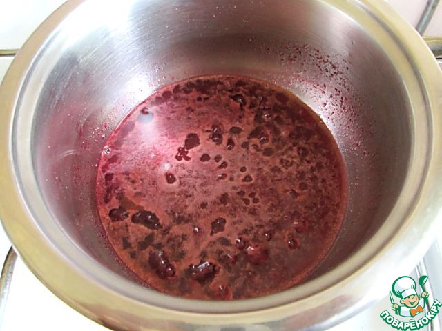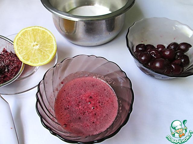Из половины общего количества вишни выжимаем сок. Если соковыжималки нет, можно поступить следующим образом: пюрировать вишню с помощью блендера и отжать пюре через сито. Выжимаем одну столовую ложку лимонного сока.