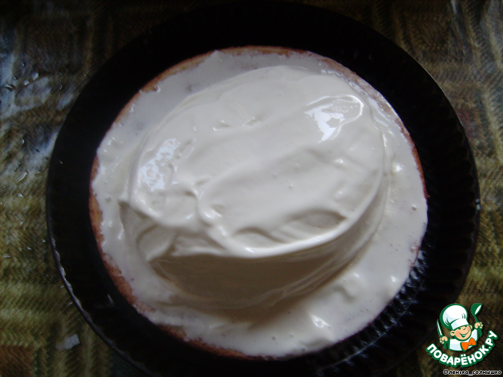 Бисквит помещаем в жаропрочную посуду, снимаем с него верхнюю "корочку", пропитываем медом и отправляем в морозилку